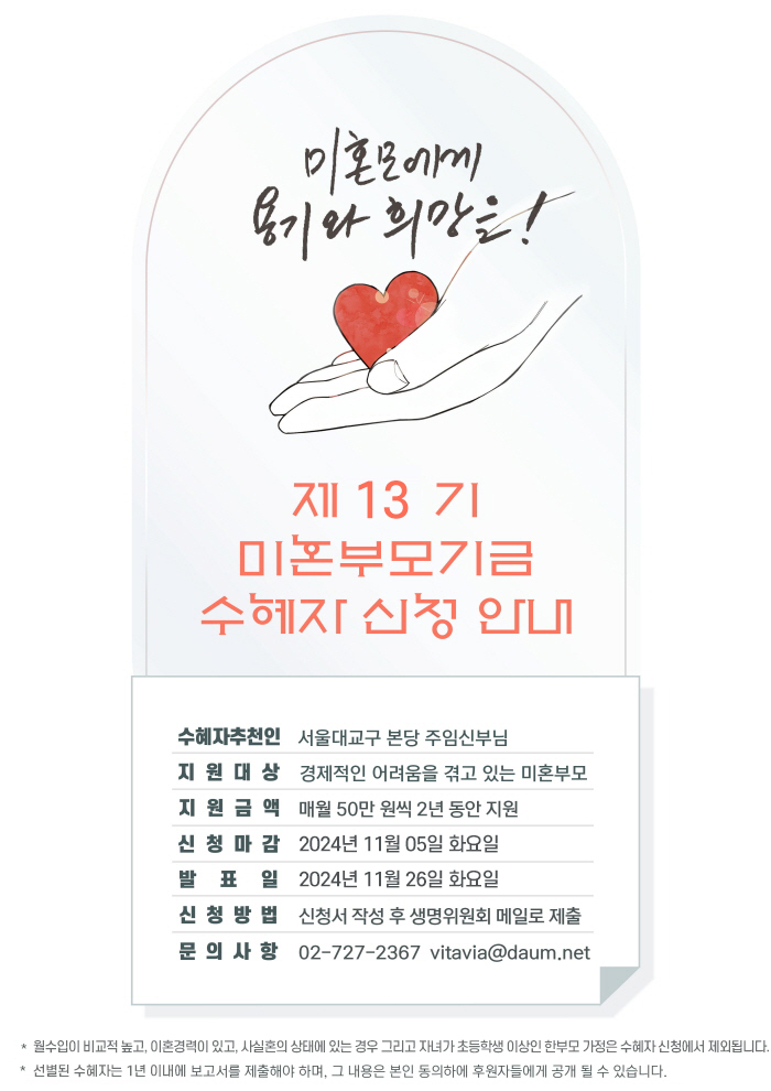 서울대교구 제13기 미혼부모기금 수혜자 신청안내